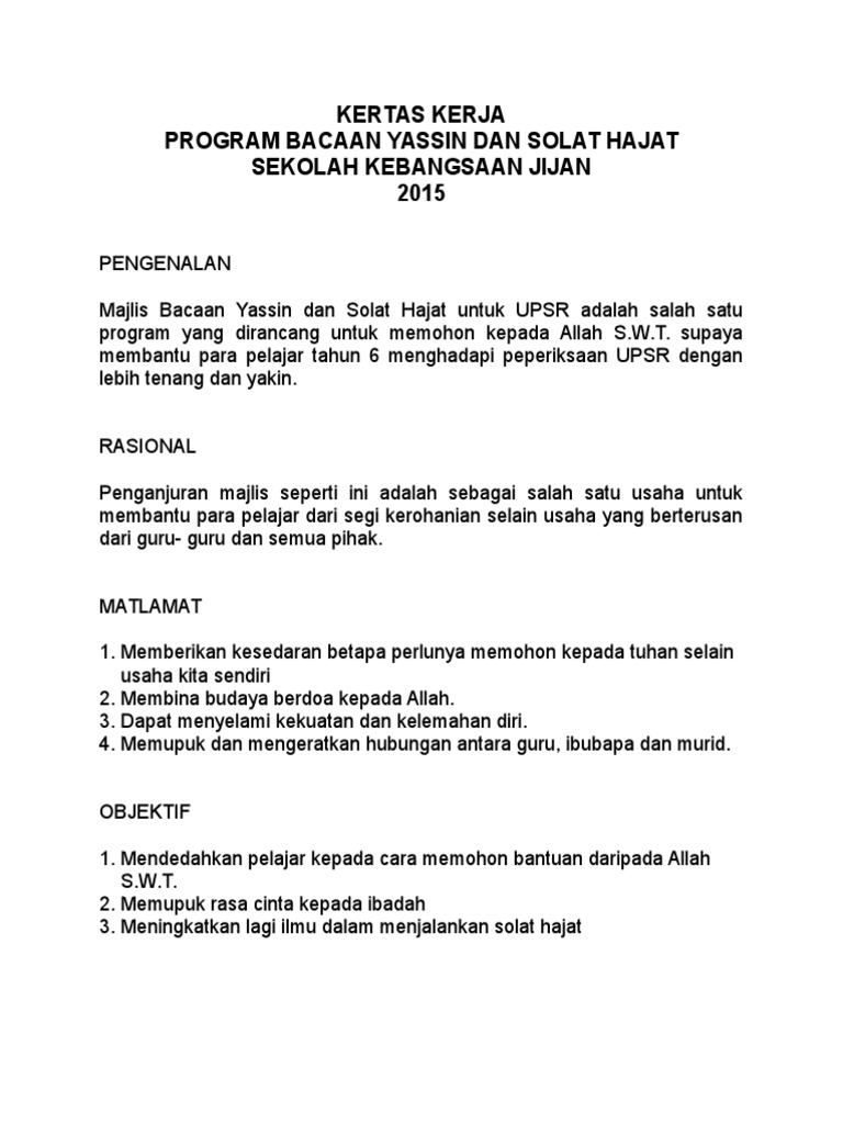 PANITIA PENDIDIKAN ISLAM DAN PROGRAM Q TAHUN 6. Kertas Kerja Program Bacaan Yasin Solat Hajat UPSR by hafizah2512. Erijahajad7 menerbitkan KERTAS KERJA PROGRAM BACAAN YASIN DAN TAHLIL BULANAN SM SAINS LAHAD DATU 2021 pada 2021-09-13.